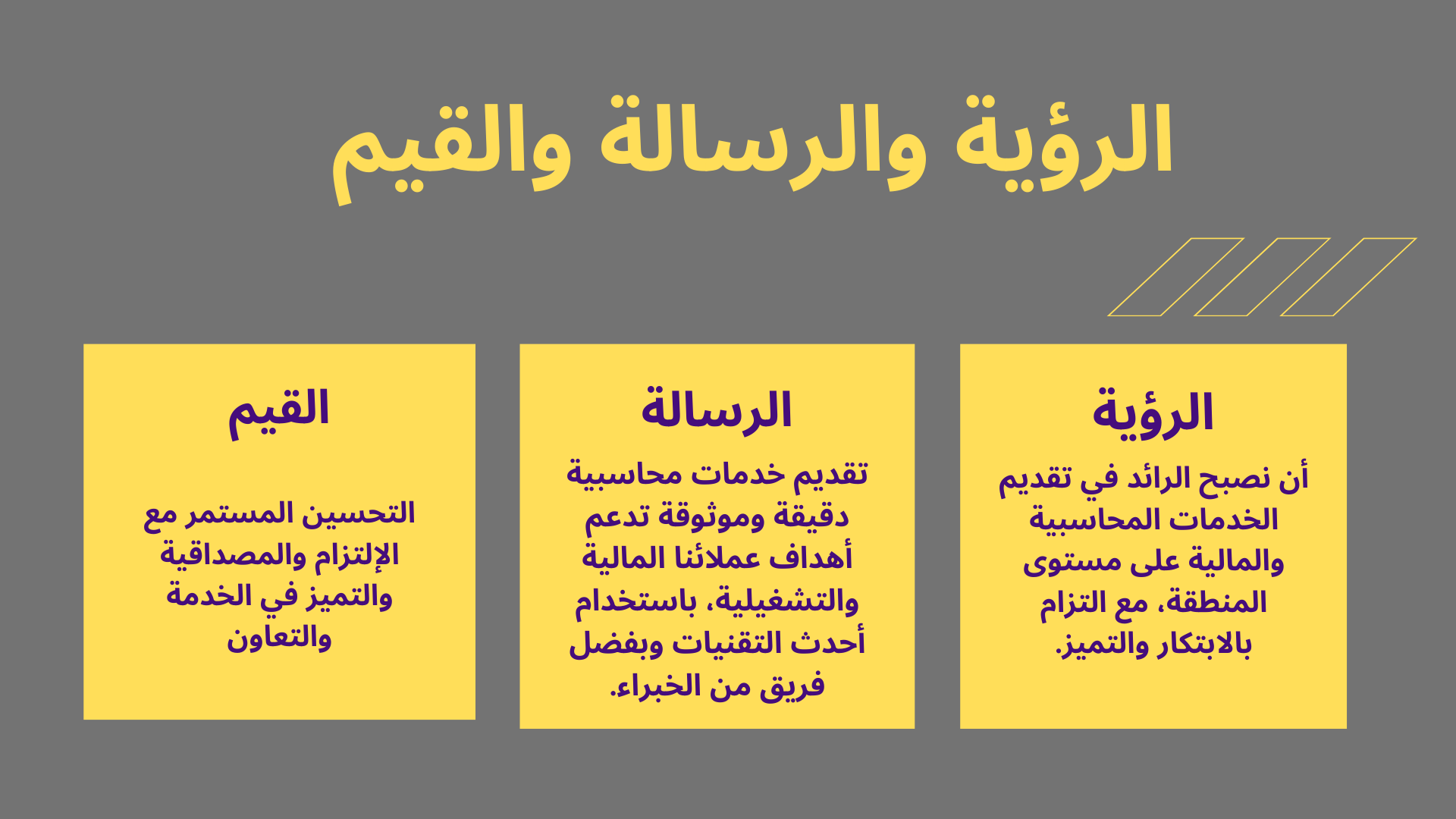 نساعد عملائنا على تحقيق المرونة والكفاءة في إدارة أعمالهم، من خلال مراجعة دقيقة وشاملة للعمليات المالية، وتحسين السيطرة عليها، وتقليل المخاطر واعداد القوائم المالية